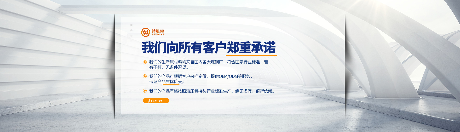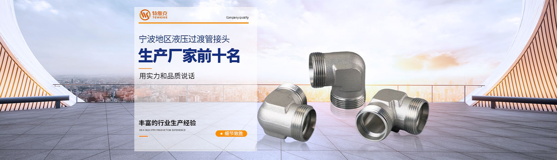 特維克公司位于國際化港口城市-浙江寧波,公司主營液壓過渡管接頭(直通、彎通、三通、四通、堵頭油塞等)。細分分類有:H型24°錐密封卡套式液壓過渡管接頭、D型74°擴口式液壓過渡管接頭、焊接式液壓過渡管接頭、ED密封堵頭油塞等等不同形式的流體連接件。廣泛應用于汽車、船舶、礦山機械、工程機械、壓縮機,冶金機械等行業的流體連接件管路系統中,產品暢銷全國20個省、市,并間接出口到歐洲及西亞。